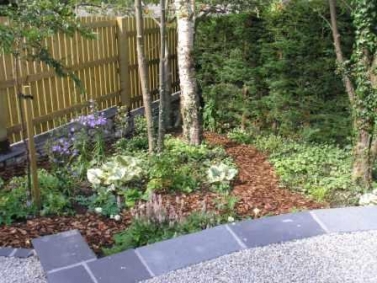 A slate path set in silver granite chippings leads from the front of the house to a new patio area at the side which catches the late afternoon and evening sun. Rocks have been carefully positioned in the gravel and the use of bamboo, Acers and flowering cherries adds to the Japanese feel.