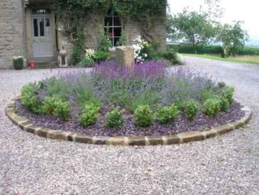 The driveway was altered and a turning circle re-instated (there was evidence that there had been one previously). The bed in the centre was edged with box and filled with lavender and salvias.