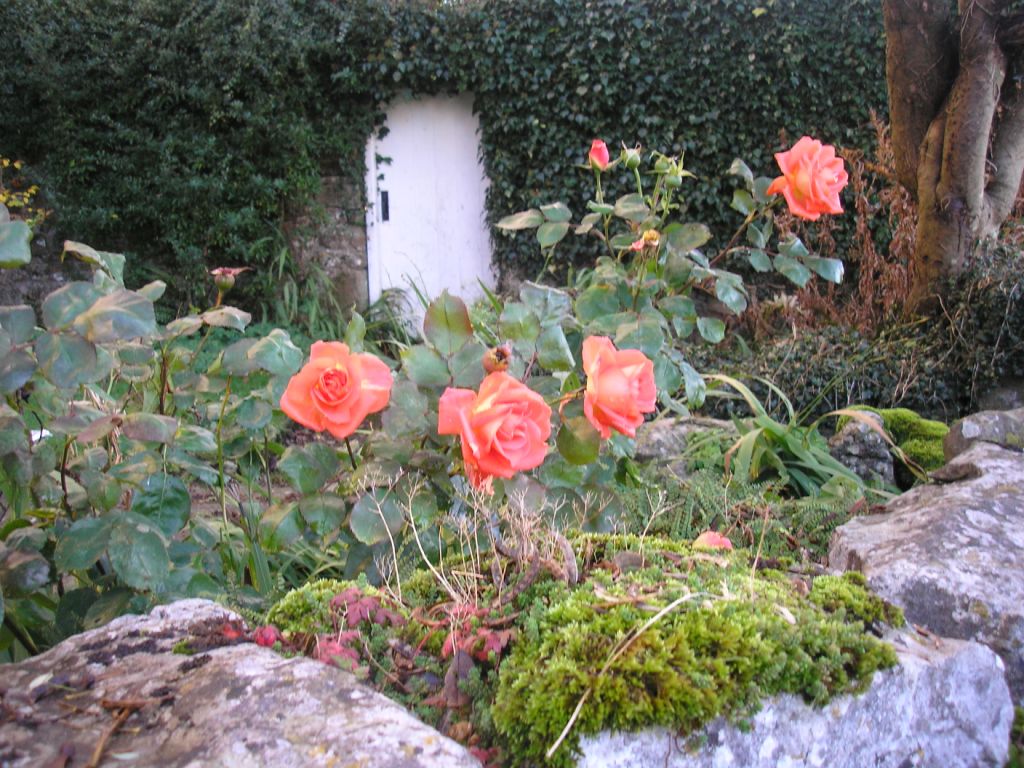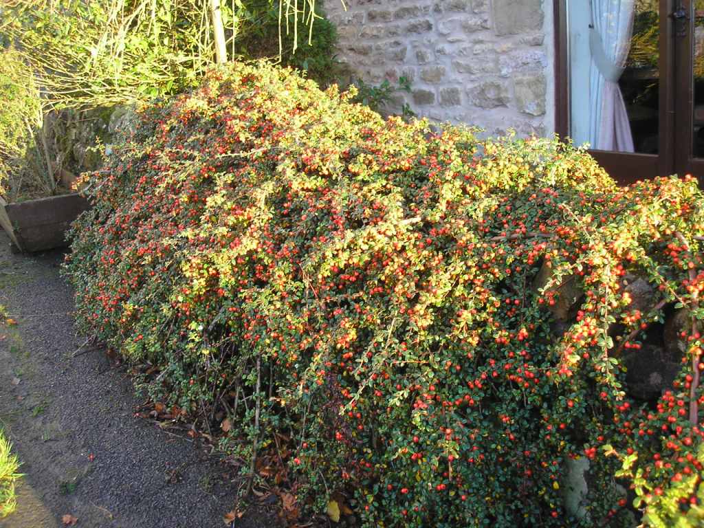 Roses in flower in Cold Cotes, North Yorkshire in mid November. Cotoneaster berries vibrant in the sunshine.